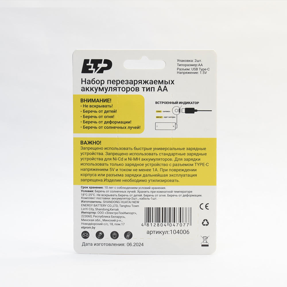 Перезаряжаемые аккумуляторы АА, 1,5V 1650mwh ETP – это литий-ионный (Li-Ion) аккумулятор, который способен накапливать и использовать электроэнергию для питания различных устройств, потребляющих большое количество электроэнергии.