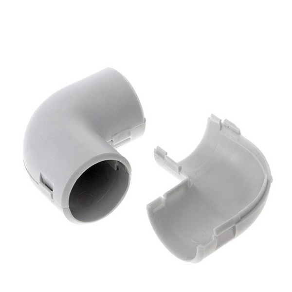 Угловой соединитель разборный предназначен для соединения жестких или гофрированных труб под углом 90°, Благодаря разъёмному корпусу, имеет возможность установки на уже смонтированную трассу. Рекомендуется для использования в сухих помещениях.