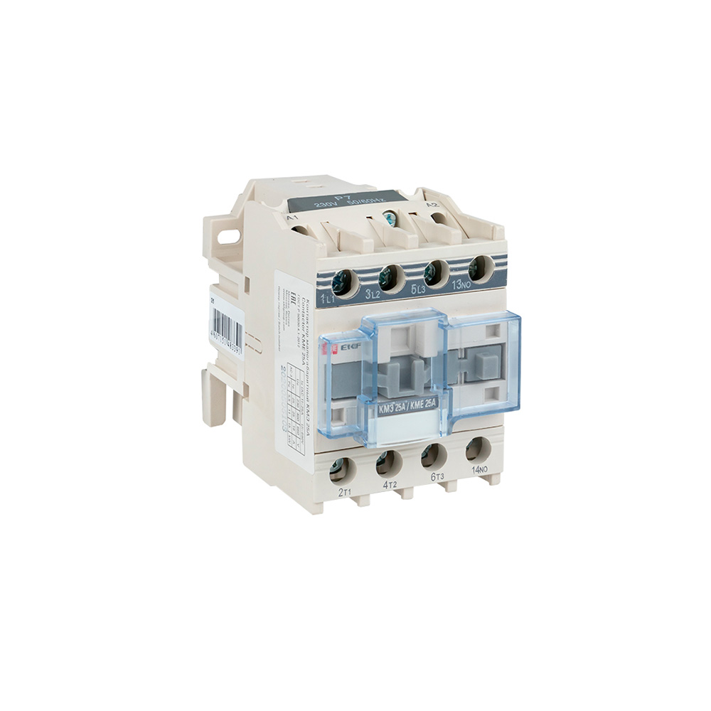 Контакторы КМЭ EKF PROxima состоят из корпуса, закрепленных в нем неподвижных контактов, подвижных контактов, которые закреплены в подвижной части магнитной системы. Неподвижная часть магнитной системы закреплена жестко в корпусе КМЭ. Пружина препятствует смыканию контактов. При подаче напряжения на катушку управления в магнитной системе контактора возникает магнитное поле, которое, преодолевая сопротивление пружины, смыкает магнитную систему и замыкает контакты. При отключении напряжения с катушки управления пружина размыкает контакты. Возможна коммутация алюминиевыми медным проводом.