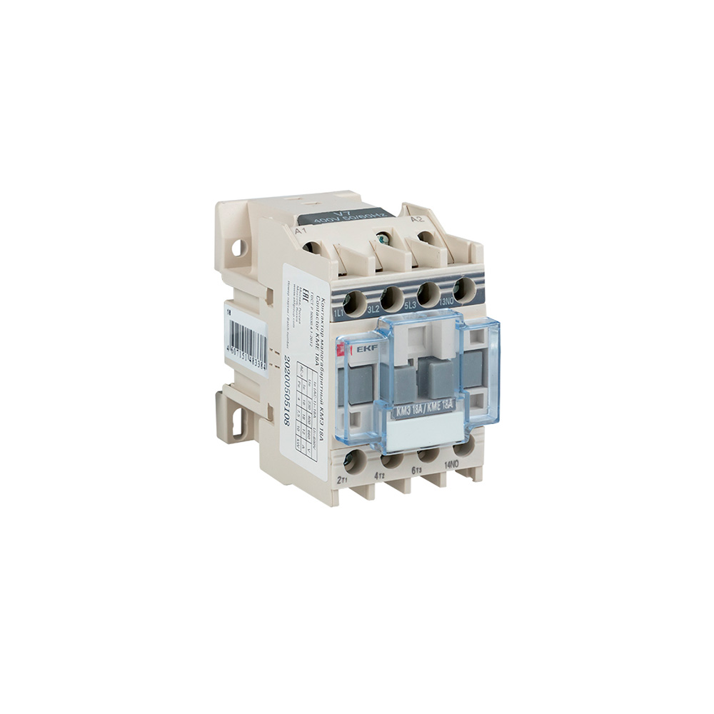 Контакторы КМЭ EKF PROxima состоят из корпуса, закрепленных в нем неподвижных контактов, подвижных контактов, которые закреплены в подвижной части магнитной системы. Неподвижная часть магнитной системы закреплена жестко в корпусе КМЭ. Пружина препятствует смыканию контактов. При подаче напряжения на катушку управления в магнитной системе контактора возникает магнитное поле, которое, преодолевая сопротивление пружины, смыкает магнитную систему и замыкает контакты. При отключении напряжения с катушки управления пружина размыкает контакты. Возможна коммутация алюминиевыми медным проводом.
