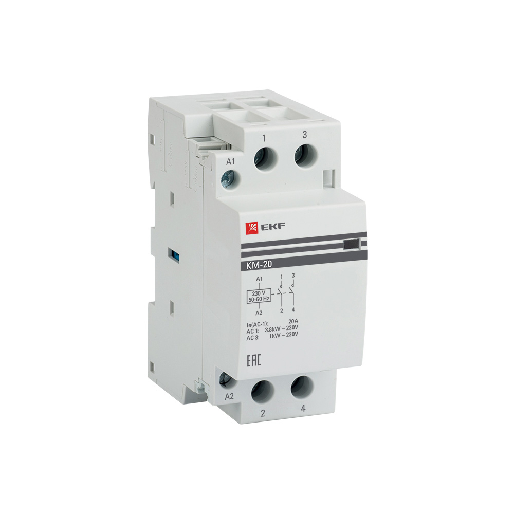 Модульные контакторы представляют из себя контактор в классическом корпусе модульного оборудования. Он состоит из неподвижных контактов, подвижных контактов, которые закреплены в подвижной части магнитной системы. Неподвижная часть магнитной системы закреплена жестко в корпусе КМ. Пружина препятствует смыканию контактов. При подаче напряжения на катушку управления в магнитной системе контактора возникает магнитное поле, которое, преодолевая сопротивление пружины, смыкает магнитную систему и замыкает контакты. При отключении напряжения с катушки управления пружина размыкает контакты. Возможна коммутация алюминиевым и медным проводом.