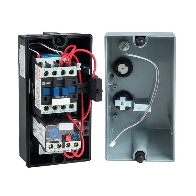 В состав устройства входят малогабаритный контактор КМЭ, тепловое реле РТЭ, кнопки управления «Пуск» и «Стоп», а также световой индикатор, размещённые в едином пластиковом корпусе с кабельными вводами. Такая компоновка исключает необходимость самостоятельного подбора компонентов и сборки схемы, что ускоряет монтаж и повышает надёжность установки. Индикация на лицевой панели позволяет визуально контролировать состояние пускателя (включён/отключён) без дополнительных измерительных приборов.