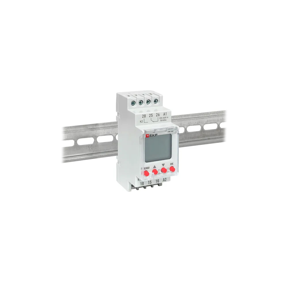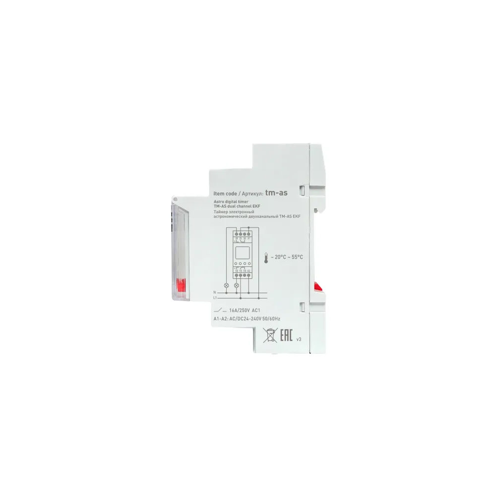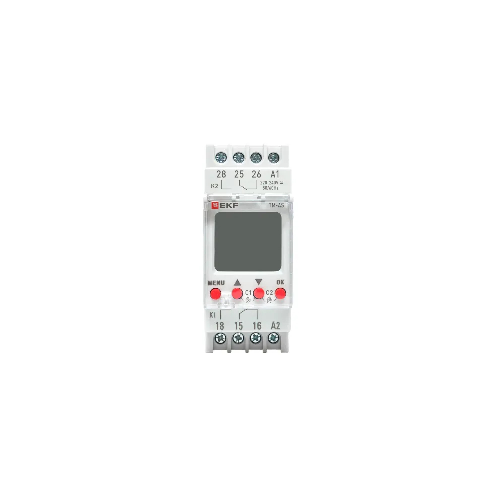 EKF PROxima TM-AS PROxima — астрономическое реле времени с двумя независимыми перекидными контактами, программированием до 80 событий и питанием 24–264 В AC/DC, предназначенное для автоматического управления освещением и другими нагрузками по времени заката/восхода солнца или по недельному расписанию.