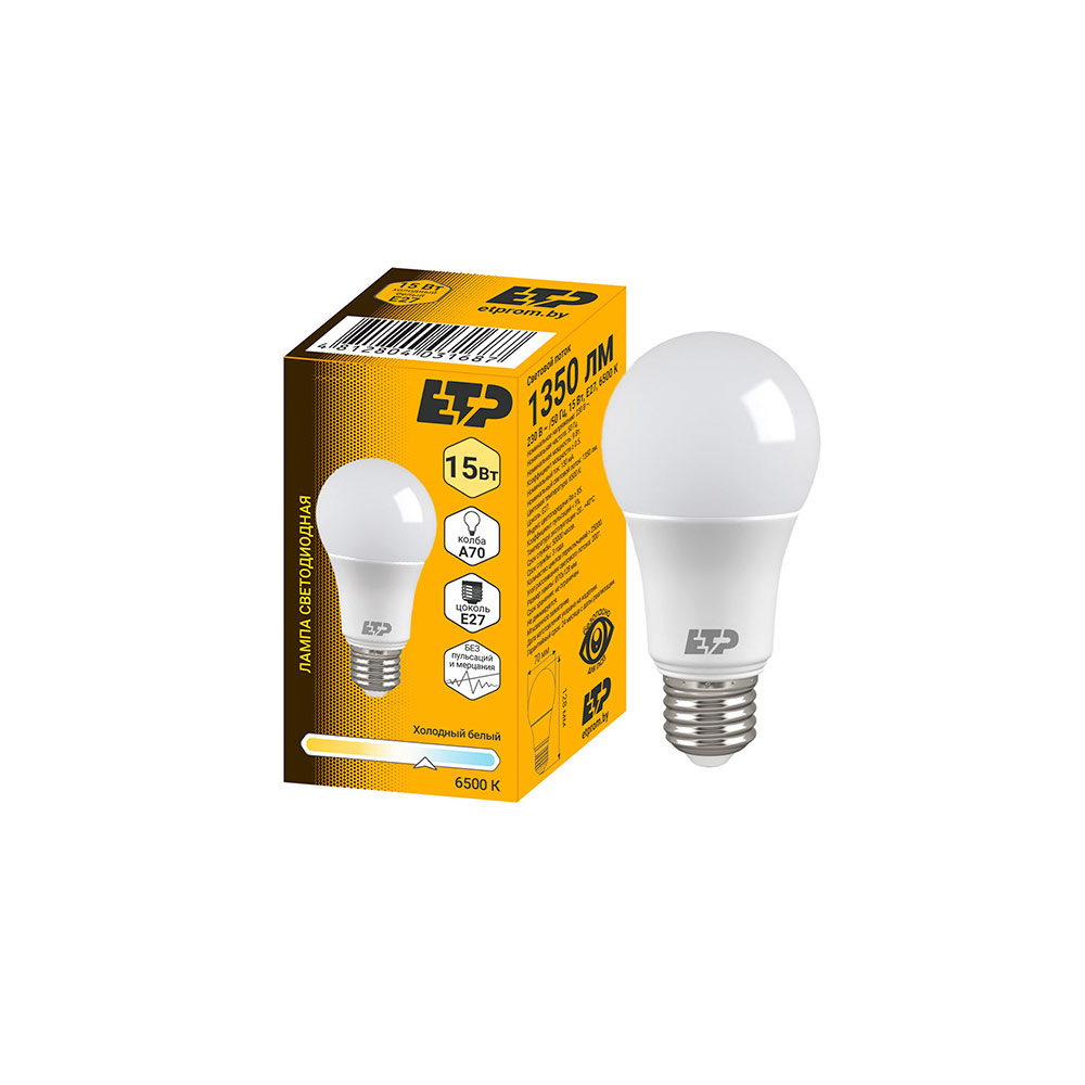 Лампа светодиодная A70 15W 6500K (50) E27 ETP – светотехническое оборудование, в котором в качестве источника света выступают светодиоды (LED). Предназначены для освещения любых типов помещений, где соблюдены эксплуатационные требования по температуре и влажности. Могут применяться в светильниках любых типов, подходящих по размеру и цоколю. Светодиодные лампы являются энергоэффективным и экологичным аналогом энергосберегающих люминесцентных источников света и ламп накаливания.