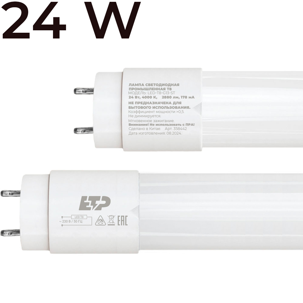 Светодиодная лампа T8 24W 4000K модели LED-T8-G13-ST ETP – современный источник света, успевший заслужить доверие покупателей, став улучшенным аналогом люминесцентной лампы. Представляет собой трубку 614мм из матового стекла, внутри которой расположены драйвер и светодиодная лента. Лампа T8 от ETP обеспечивает европейское качество, сочетая в себе доступную цену и отличные характеристики.