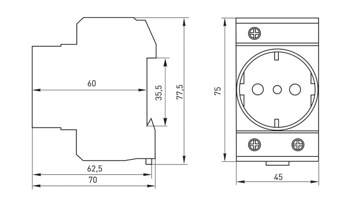 Розетка модульная с заземлением РДЕ-47 предназначена для применения в однофазных силовых и вспомогательных цепях переменного тока для подключения электрических приборов (переносных ламп, блоков питания и т.д.).
