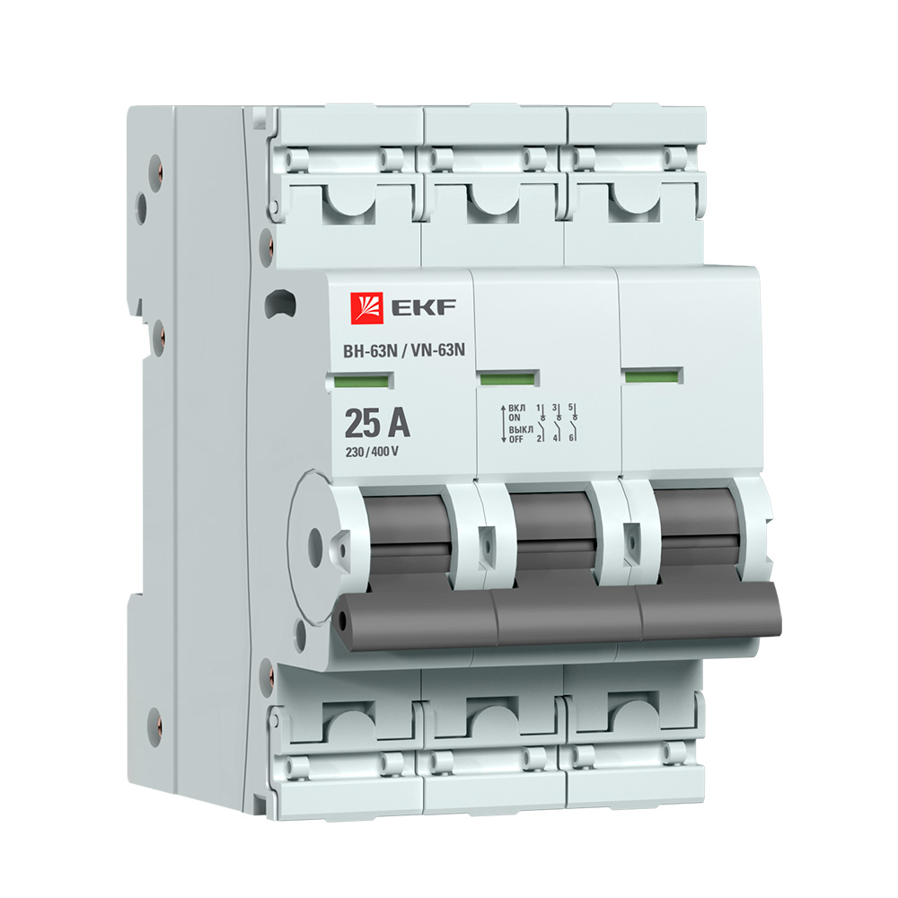 Выключатели нагрузки ВН-63N EKF PROxima являются обновлённой платформой успешно зарекомендовавших себя на рынке линейки выключателей нагрузки ВН-63 EKF PROxima. Выключатели нагрузки являются механическими коммутационными аппаратами и применяются для оперативных включений и отключений в электрических цепях переменного тока. Выключатели предназначены для коммутации активных и индуктивных нагрузок, включая двигатели, уже защищенные другими коммутационными аппаратами. Особенностью данной серии является усовершенствованная конструкция. В выключателях имеются пластиковые крышки, закрывающие доступ к винтовым зажимам и служащие для опломбирования выключателей, что исключает несанкционированный доступ к проводникам. Корпус выключателей усилен дополнительными заклепками для обеспечения его максимальной жесткости. Выключатели оборудованы удобной рукояткой управления, обеспечивающей надежное оперирование аппаратами. На лицевой панели выключателей нагрузки имеется цветовой индикатор реального состояния контактов. Конструкция двухпозиционного зажима обеспечивает удобный монтаж выключателя на DIN-рейку.