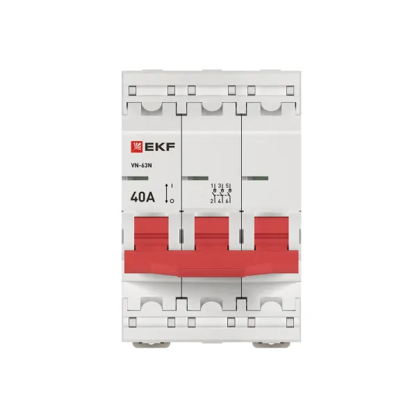 Выключатель нагрузки ВН-63N 3P 40А PROXIMA EKF — трёхполюсный коммутационный аппарат с номинальным током 40 А и напряжением до 400 В, модернизированная версия серии ВН-63, оснащённый двухпозиционными зажимами для удобного монтажа на DIN-рейку, пластиковыми крышками для опломбирования клемм и цветовым индикатором реального состояния контактов.