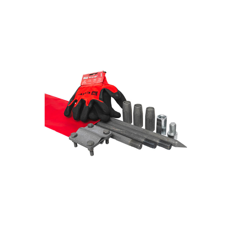 Комплекты заземления предназначены для устройства защитного заземления электроустановок и оборудования, организации заземления молниезащиты. Данный комплект включает в себя: стальные стержни в термодиффузионном цинковании D=16мм длиной 1500мм - 4 шт., муфта соединительная - 3 шт., зажим для подключения проводников, винт ударный и гайка для забивания, перчатки для удобства монтажа, паспорт на изделие.