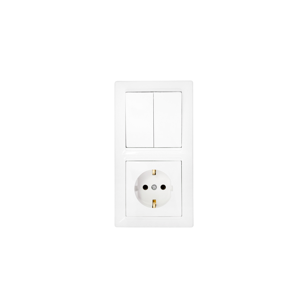 - Тип: комбинированное устройство скрытой установки (двухклавишный выключатель + розетка).
