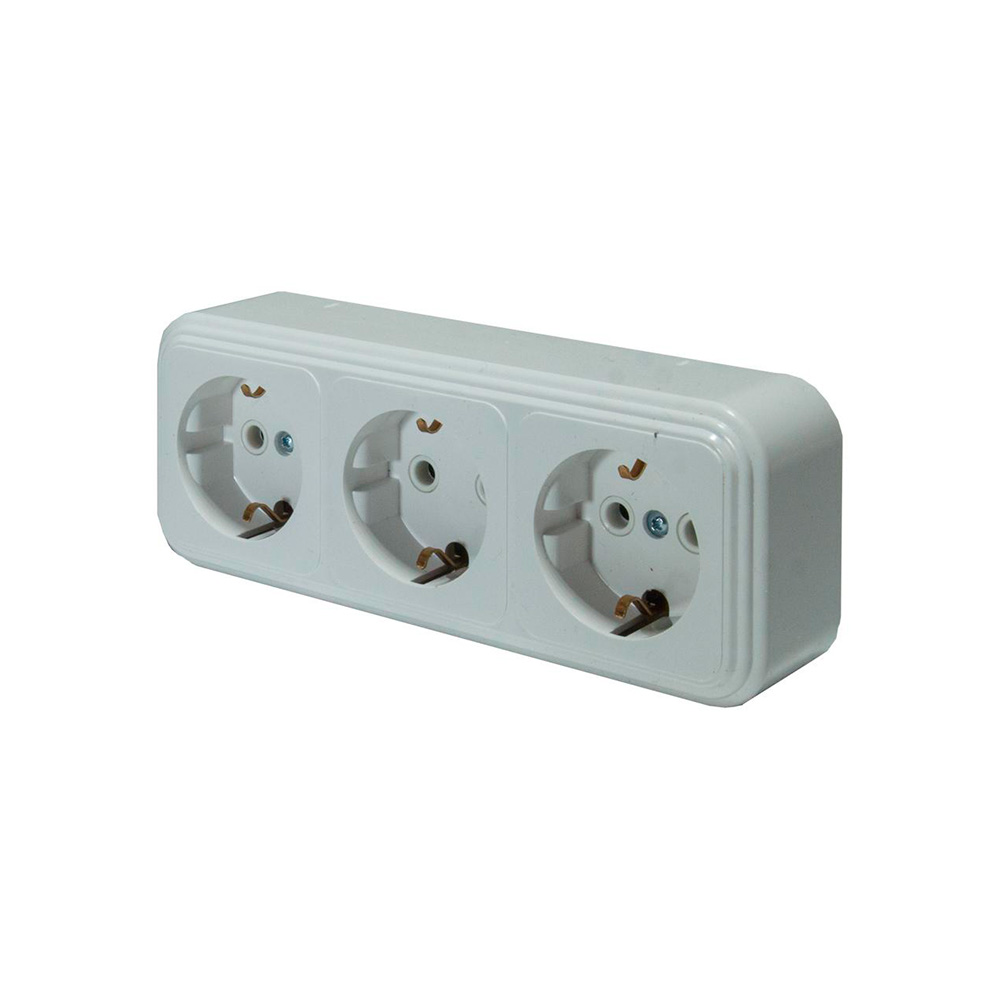 Трехместная розетка штепсельная двухполюсная открытой установки с заземляющим контактом предназначена для присоединения электрических приемников с номинальным напряжением 250 В к электрической сети переменного тока в нормальных климатических условиях внешней среды по ГОСТ 15150 и ГОСТ 15543.1.