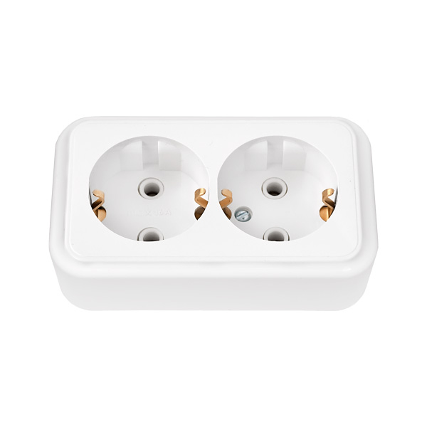 - Тип: двухместная розетка с заземляющими контактами для открытой установки.