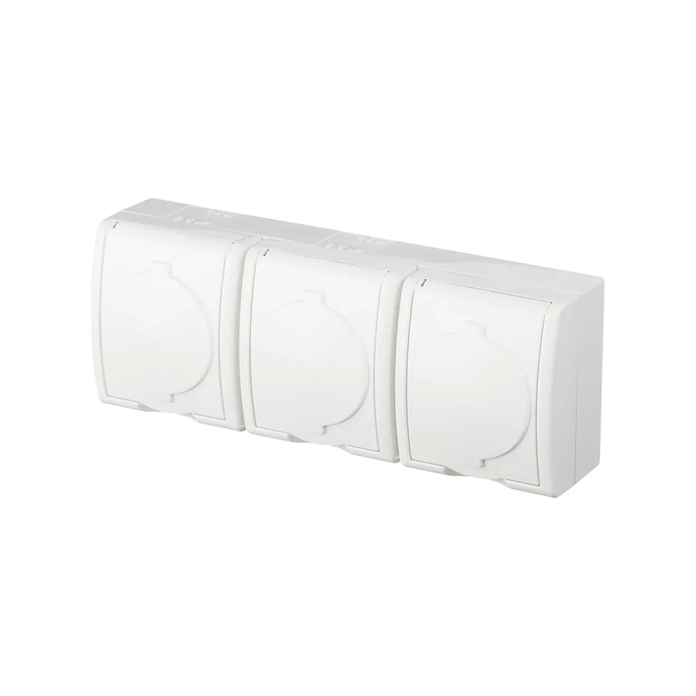 Тройная розетка Simon 15 Aqua Schuko 2Р+Е 16A белого цвета для накладного монтажа предназначена для установки на улице и во влажных помещениях. Данный блок розеток имеет крышку, которая обеспечивает ей 54-ую степень защиты от пыли и брызг (дождя). Крышка удобно открывается на 180 градусов по вертикали. Розетки для улицы Симон 15 изготовлены из поликарбоната и АБС-пластика, что позволяет обеспечить надёжность и долговечность по доступной цене. Медная контактная группа с добавлением серебра не теряет высокую упругость даже спустя много лет эксплуатации. Прочный корпус из АБС-пластика крепится к основанию на шурупы, устойчив к UV-излучению и механическому воздействию.