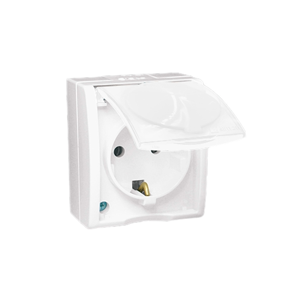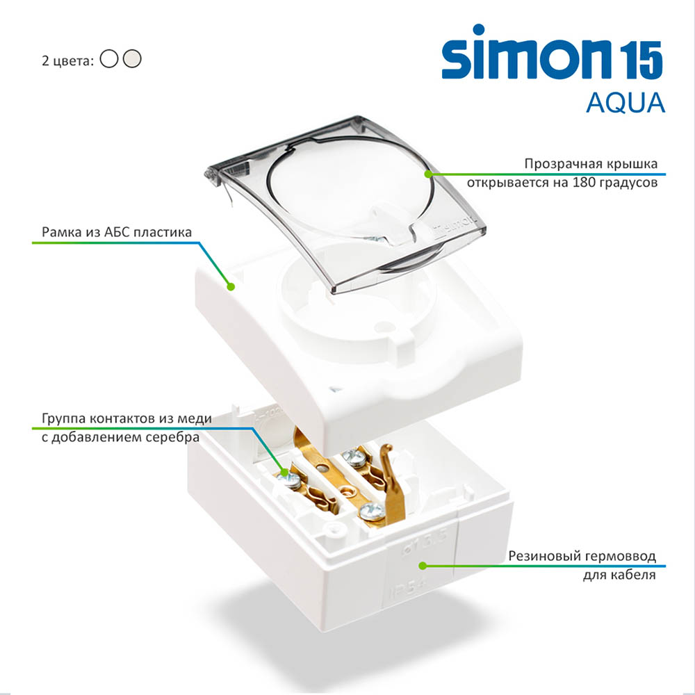 Розетка Simon 15 Aqua Schuko 2Р+Е 16A белого цвета для накладного монтажа предназначена для установки во влажных помещениях и использования под открытым небом. Данная розетка имеет крышку, которая обеспечивает ей 54-ую степень защиты от пыли и брызг (дождя). Крышка удобно открывается на 180 градусов по вертикали. Розетка Симон 15 изготовлена из поликарбоната и ABC-пластика, что позволяет обеспечить надёжность и долговечность по доступной цене. Медная контактная группа с добавлением серебра не теряет высокую упругость даже спустя много лет эксплуатации. Прочный корпус из ABC-пластика крепится к основанию на шурупы и устойчив к UV-излучению и механическому воздействию.