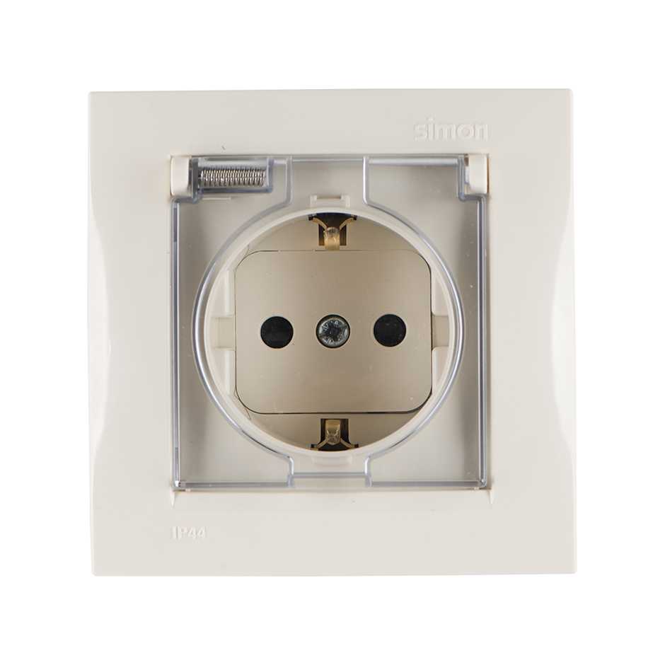 Розетка IP44 с заземлением Simon 15 Schuko 2Р+Е 16A цвета слоновая кость изготовлена из поликарбоната и ABC-пластика, что позволяет обеспечить надёжность и долговечность по доступной цене. Данная розетка имеет крышку и защитные шторки. Крышка обеспечивает 44-ю степень защиты для розетки и открывается на 180 градусов по вертикали, а шторки защитят от любопытных детей. Медная контактная группа с добавлением серебра не теряет высокую упругость даже спустя много лет эксплуатации. Лицевая панель розеток Симон 15 из прочного ABC-пластика крепится на винт и устойчива к UV-излучению и механическому воздействию.