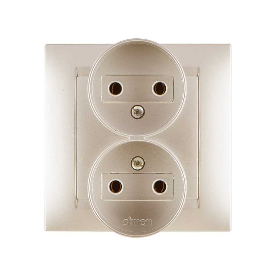 Двойная розетка без заземления Simon 15 2x2Р 16A цвета шампань. Сдвоенная розетка Симон 15 изготовлена из поликарбоната и ABC-пластика, что позволяет обеспечить надёжность и долговечность по доступной цене. Медная контактная группа с добавлением серебра не теряет высокую упругость даже спустя много лет эксплуатации. Лицевая панель розетки из прочного ABC-пластика крепится на винт и устойчива к UV-излучению и механическому воздействию.