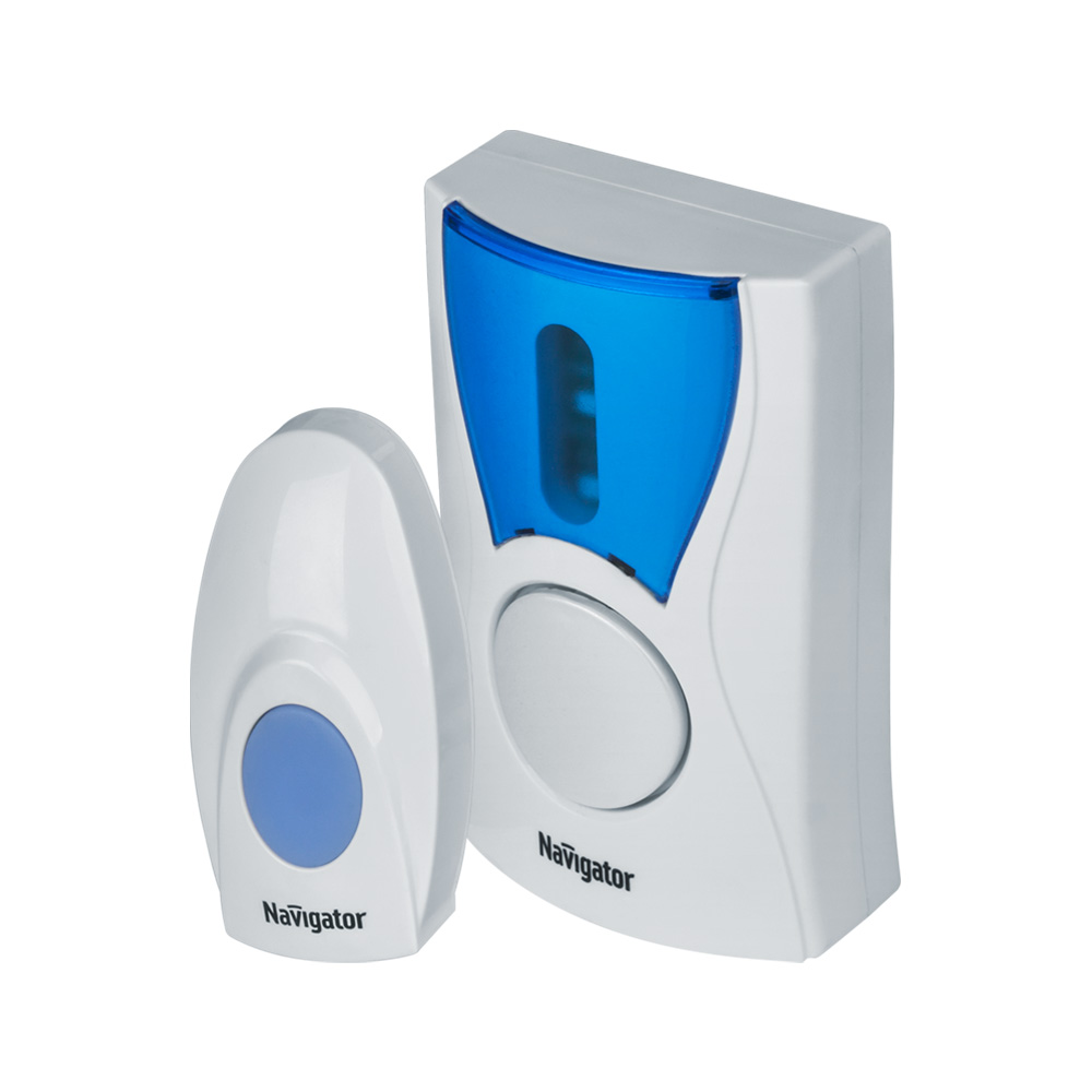 Navigator NDB-A-DC02-1V1-WH — беспроводной дверной звонок на батарейках с радиусом действия до 100 метров на открытом пространстве, предназначенный для установки в помещениях или на загородных участках без подключения к электросети.