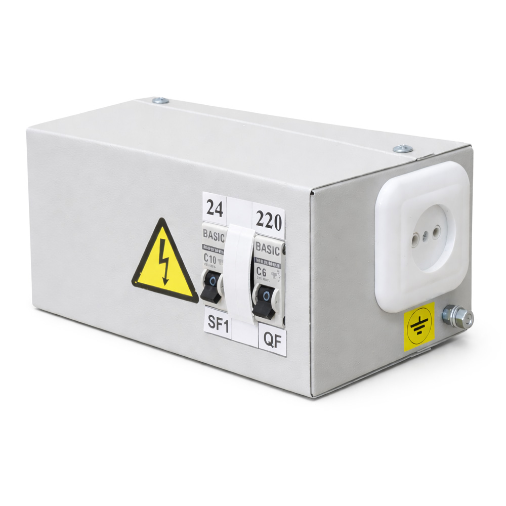 Изделие представляет собой металлический корпус с закрывающейся крышкой, внутри которого смонтированы трансформатор, два автоматических выключателя и розетка. Такая конструкция позволяет использовать ящик как готовое решение для организации безопасного пониженного напряжения 24 В непосредственно на объекте. Благодаря наличию двух автоматических выключателей обеспечивается раздельная защита первичной и вторичной цепей, а также удобство отключения трансформатора от сети при обслуживании.