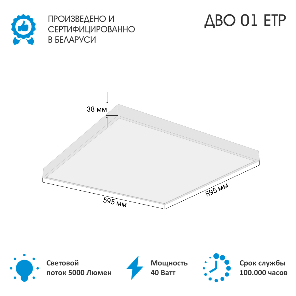 Светодиодная панель ДВО 01-1х40х003 IP54 УХЛ4 ETP с цветовой температурой 6500К применяется для общего освещения в торговых залах, в офисных и общественных помещениях, в административных и производственных зданиях. Благодаря качественному драйверу с надёжными электрокомпонентами, наши светодиодные панели ДВО 01 ETP отлично подойдут для использований в кабинетах со сложными компьютеризированными устройствами: в медицинских центрах, различных лабораториях, исследовательских центрах, серверных комнатах и т.п..