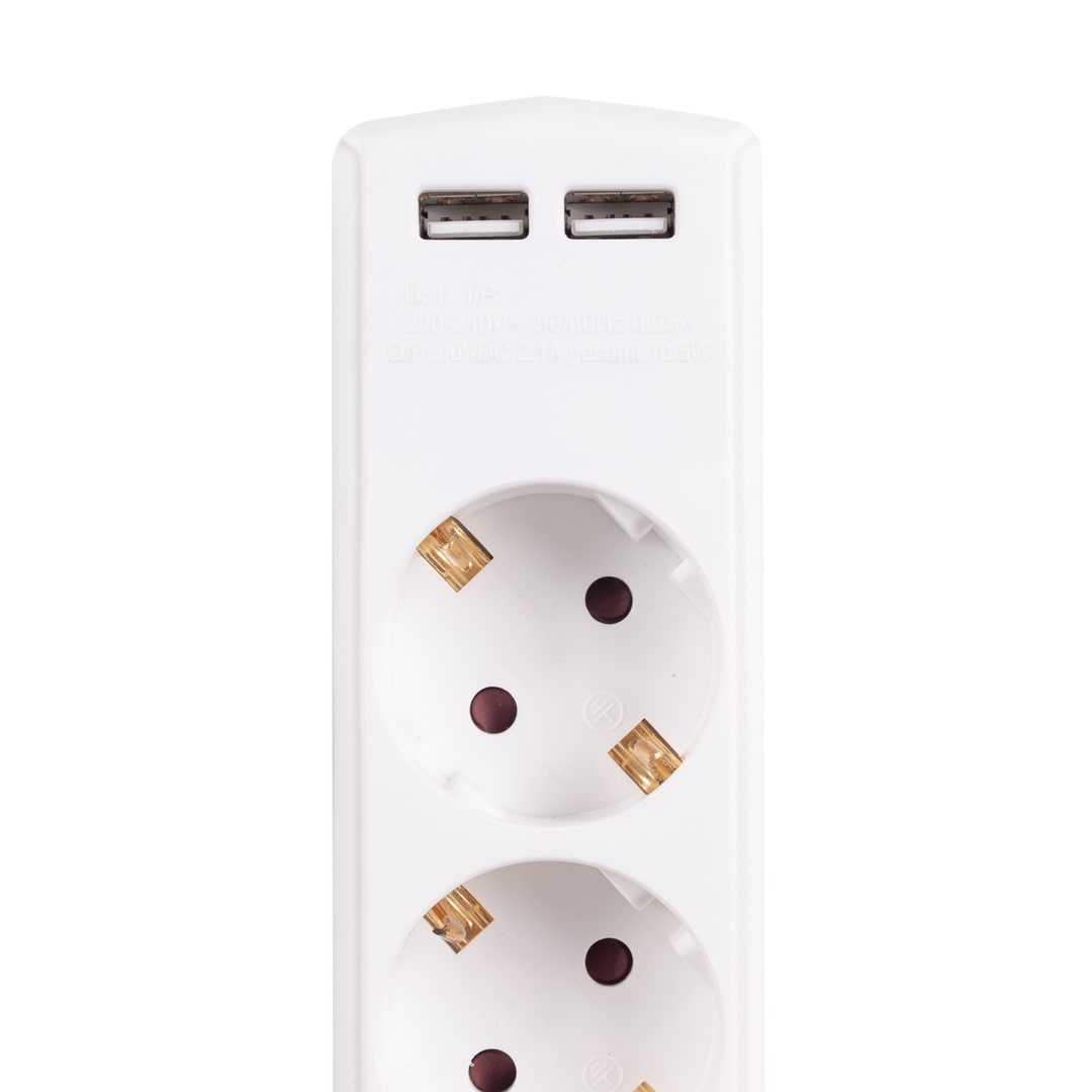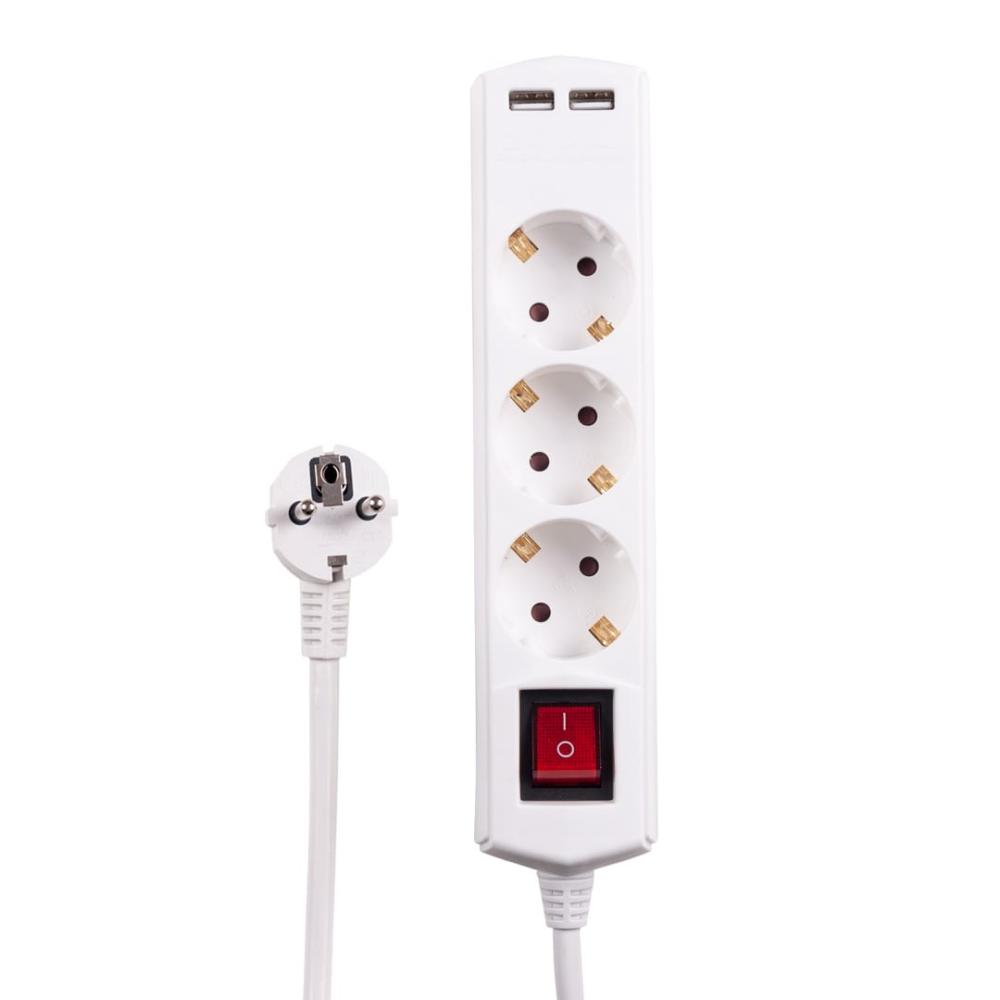 Белый удлинитель с USB 3 гнезда 2м, 16А/3,6кW с з/к, ПВС 3х1,5 ETP с двухметровым проводом ПВС из 100% меди позволяет подключать к нему бытовые приборы высокой мощности общей нагрузкой до 3680 Вт. Удлинитель с заземлением, клавишей выключения и двумя USB гнездами для подзарядки гаджетов имеет колодку из ударопрочного и негорючего полипропилена. Защитные шторки предназначены обезопасить человека от нежелательного контакта с электроне сущими деталями удлинителя и от попадания пыли во внутрь. Неразборная литая вилка с округленными углами будет служить долго и безопасно.